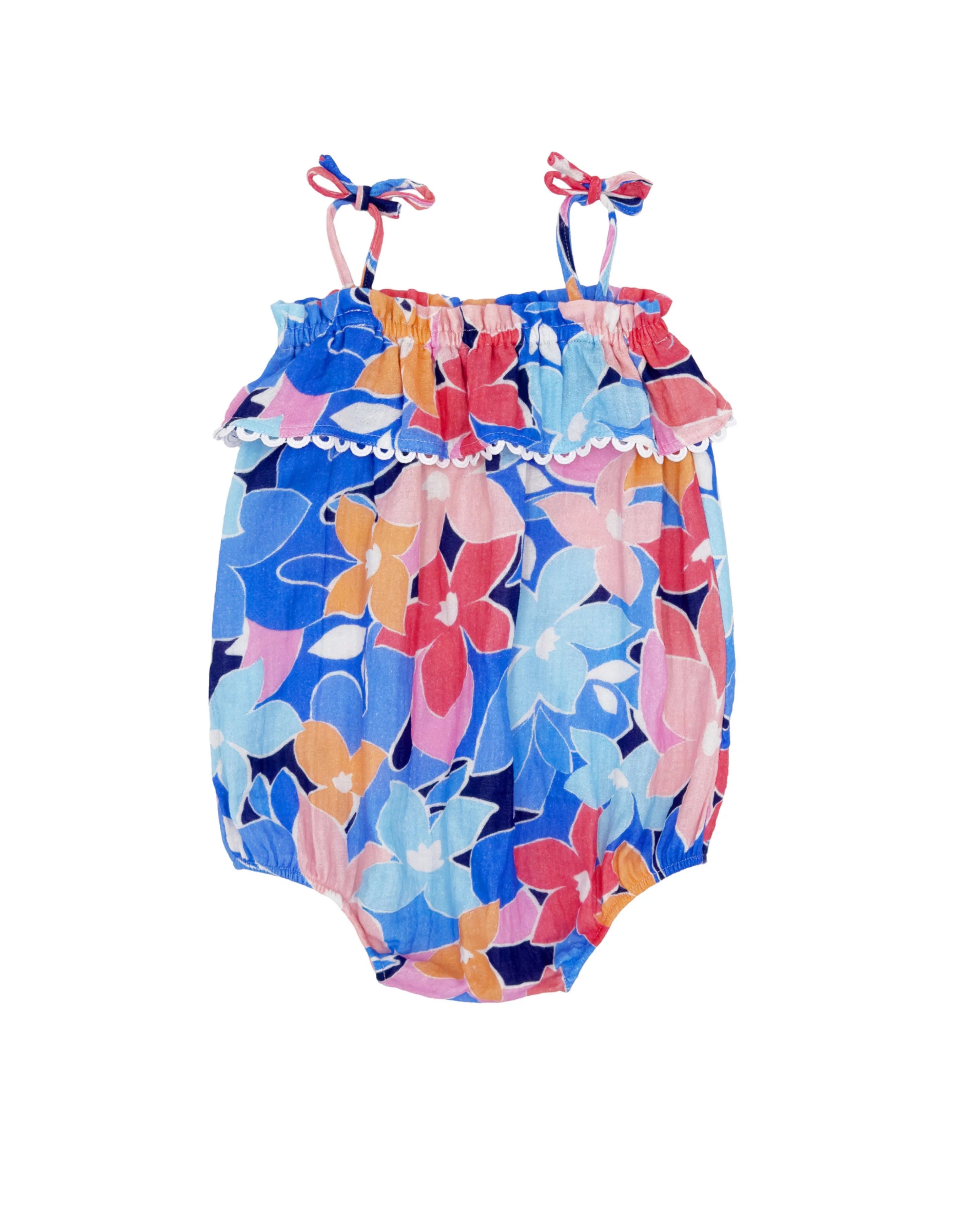 - Baby girl bubble romper with ruffle detail and scallop hem, elastic around chest and legs, snap closure at bottom for easy changing.