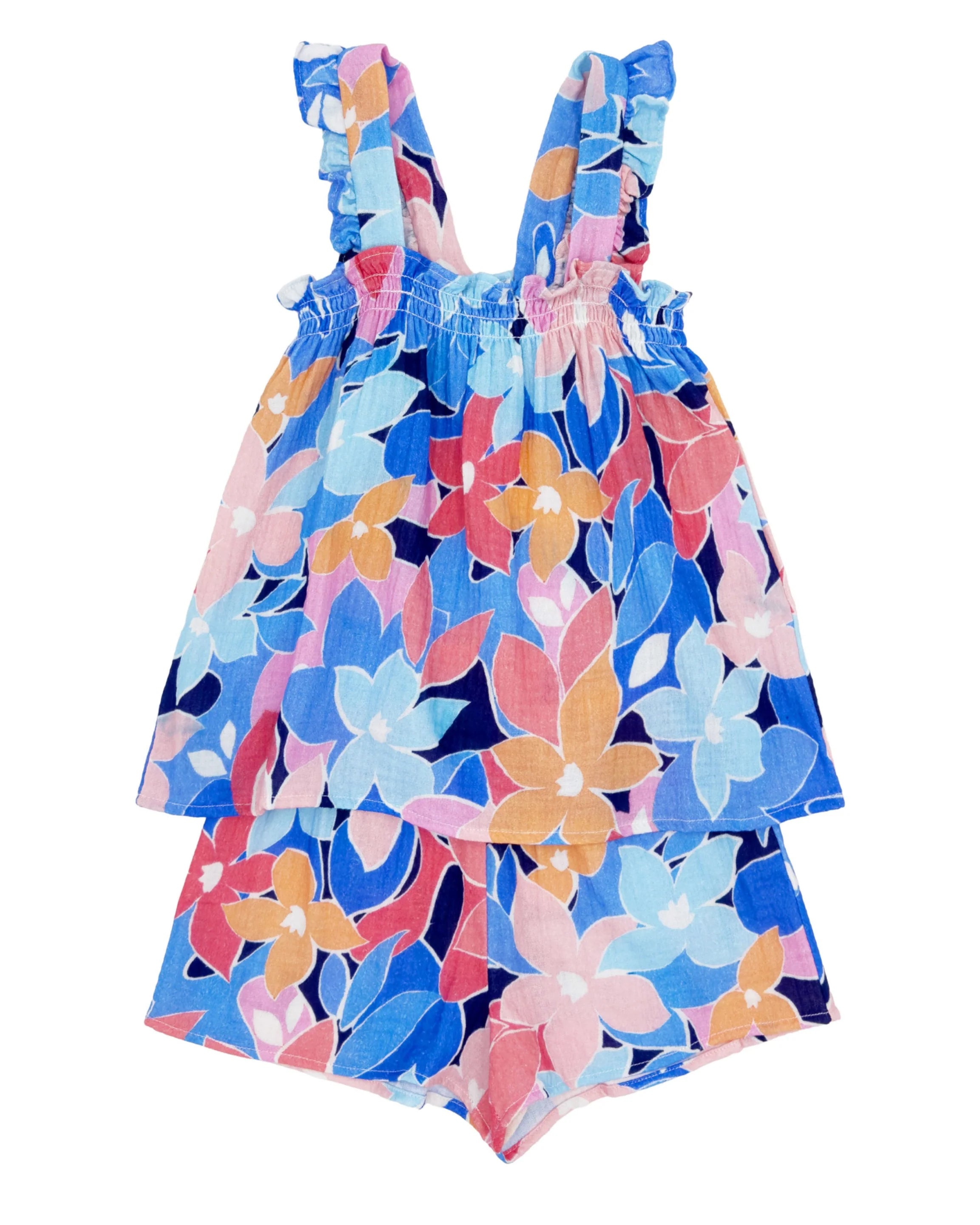 - Girl short and tank top set with ruffle detail on straps and neckline, shorts with smocked waistband.