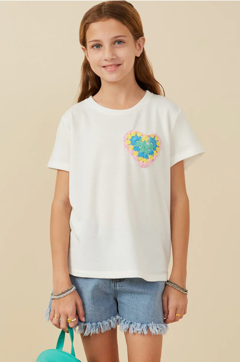 Let your little girl show off her heart in this charming off-white tee with a crochet heart pocket. Perfect for any occasion, this tee adds a playful touch to any outfit. (Heart-shaped pockets and crochet details? A winning combo!)