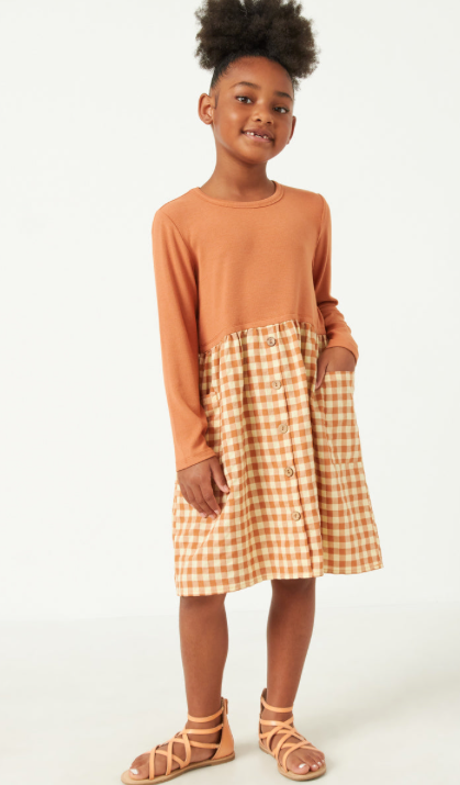 Hayden Girls - Ribbed Mix Media Button Gingham Dress - Apricot