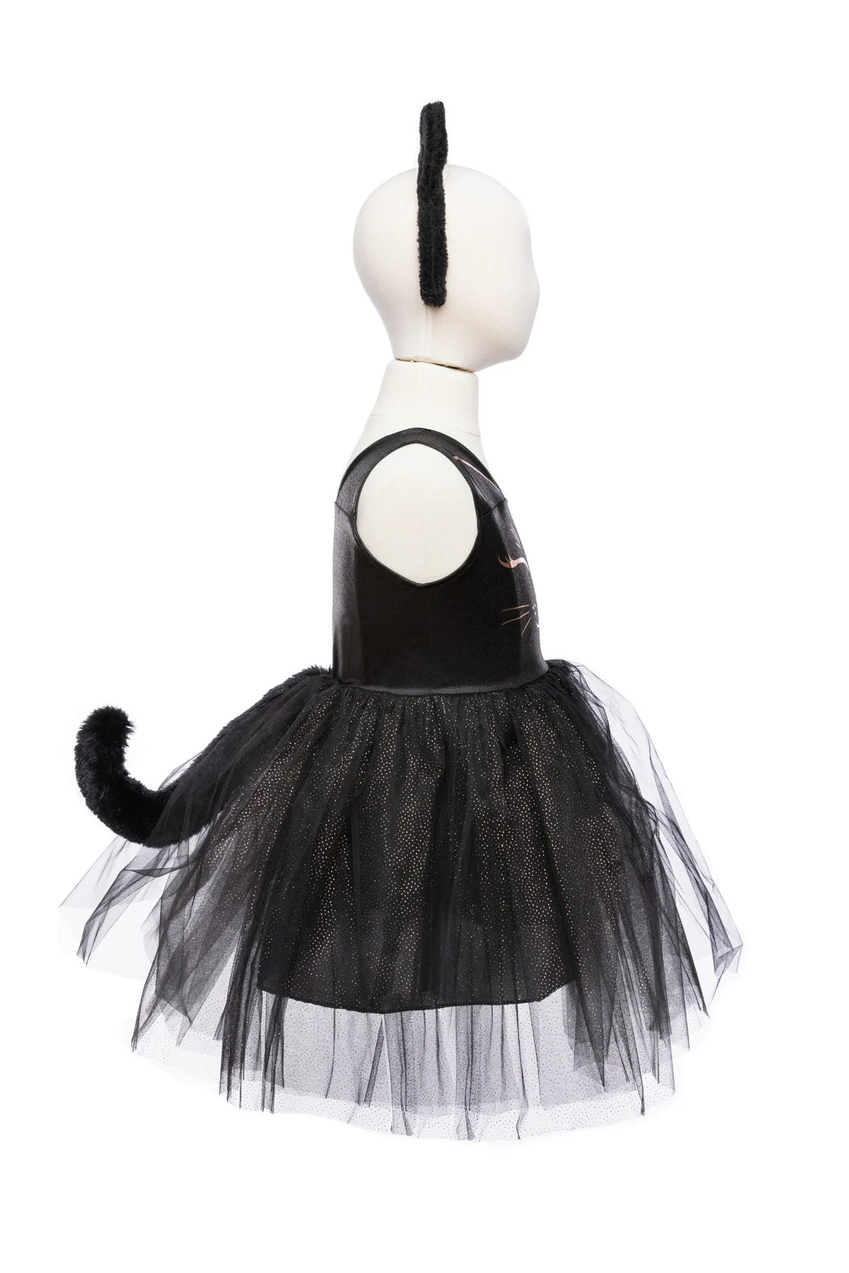 Our new Black Cat Dress & Headband is the purrfect ensemble for your little feline aficionado! The dress features a sleek black design adorned with a charming cat face printed in shimmering rose gold on the chest. Its skirt dazzles with golden heat-sealed sparkles, adding a touch of glamour to every twirl. And what's a cat costume without a tail? Fear not, as this dress includes a furry cat tail to complete the look with a playful flourish.